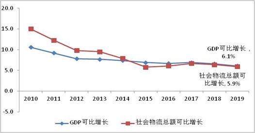 2010-2019年社会物流总额与GDP可比增长对比(单位:%)