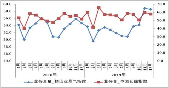 2018-2019年物流业景气指数、中国仓储指数业务量指数走势