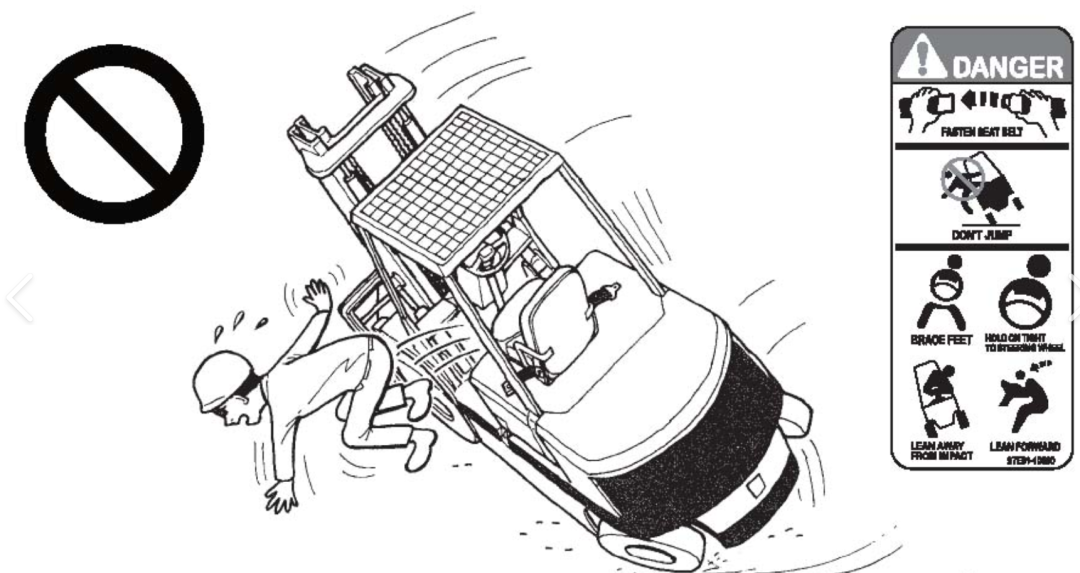 叉车过载或重量分配不当可能导致卡车向前倾斜,而侧向溢出最常发生在转弯或斜坡上。教操作员在等级上缓慢而小心地行驶,不要使叉车超载。操作员还应接受如何在翻倒时做出反应的培训:跳下车总是错误的动作,因为这个动作会增加受伤的机会。