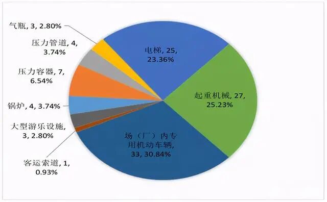 按设备类别划分,锅炉事故4起、死亡4人,压力容器事故7起、死亡14人,气瓶事故3起、死亡4人,压力管道事故4起、死亡5人,电梯事故25起、死亡19人,起重机械事故27起、死亡31人,场(厂)内专用机动车辆事故33起、死亡28人,客运索道事故1起,大型游乐设施事故3起、死亡1人。(见图3、图4)其中,场(厂)内专用机动车辆、起重机械和电梯事故占比较大,约占事故总起数的79.4%、死亡总人数的73.6%。