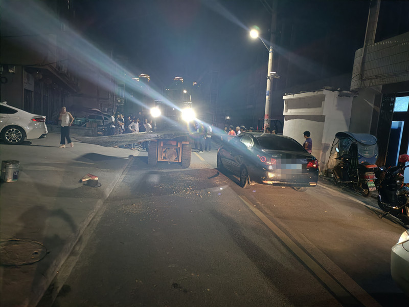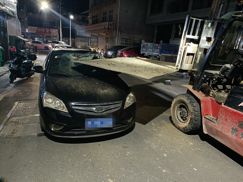 收到警令的值班民警赶到现场发现,在八里南路接近八里街的路口,一辆叉车升降臂上背着一块大铁皮,铁板左侧一角将现代车驾驶位前挡风玻璃砸出一个大窟窿,地上铺了一地碎玻璃,周边围了一群看热闹的市民。