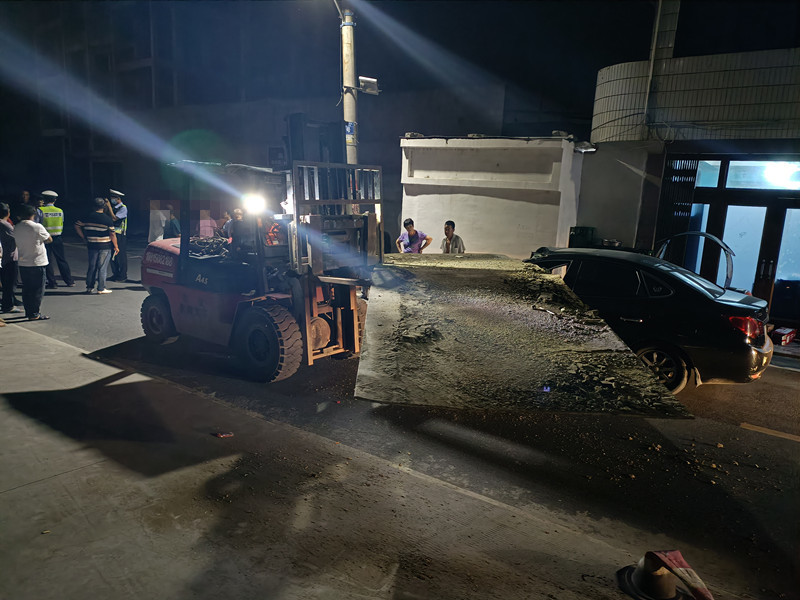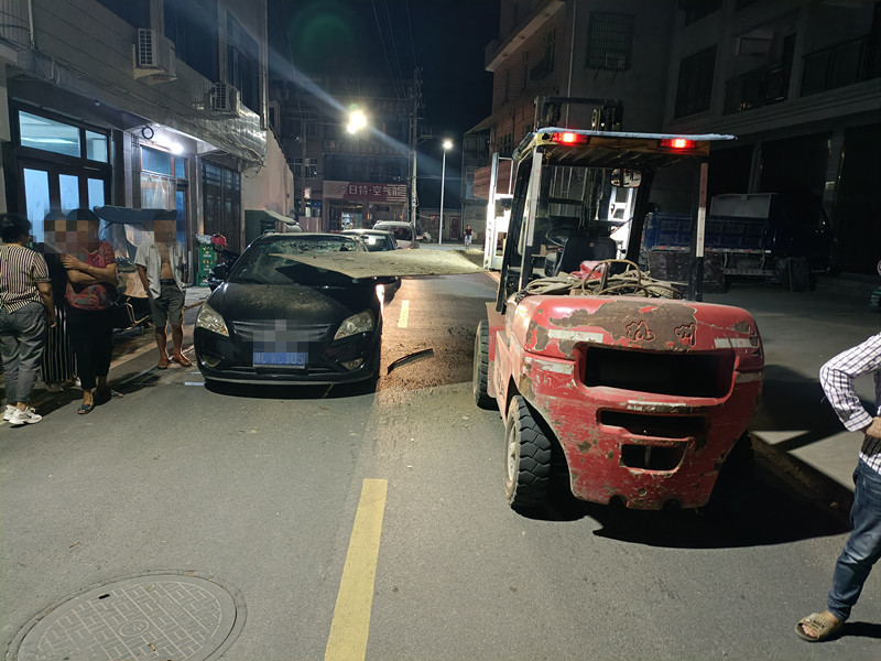 9月16日晚,永嘉桥下交警接到一起警情:在永嘉县桥下镇八里村八里南路接近八里街的路口发生一起交通事故,一辆叉车与一辆现代发生碰撞,双方驾驶员均未受伤。起因是叉车起降臂上的大铁皮将现代车前挡风砸出个大窟窿。