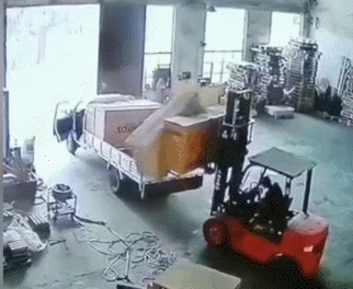 一辆叉车在进行装货作业,就在叉臂即将落下的时候,货物突然出现了倾斜,摇摇欲坠。